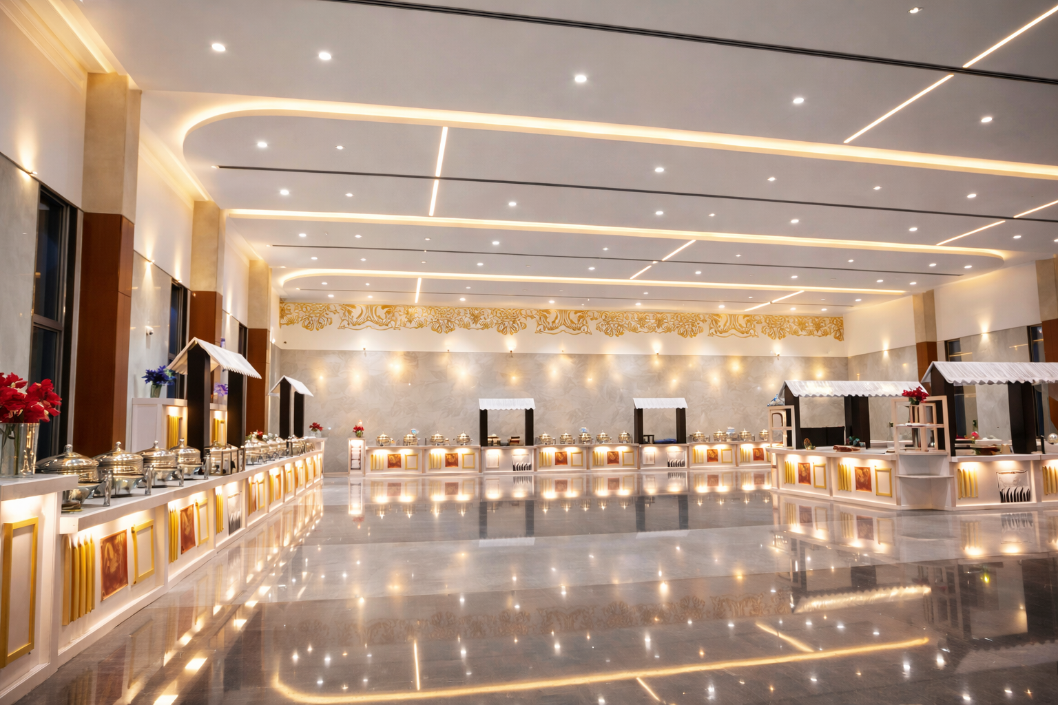 Premium dessert and fruit display setup with floral decoration in a luxury convention hall event