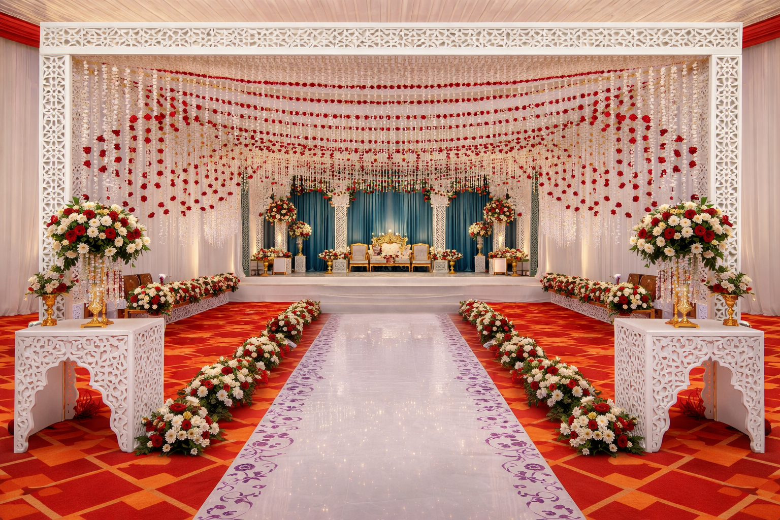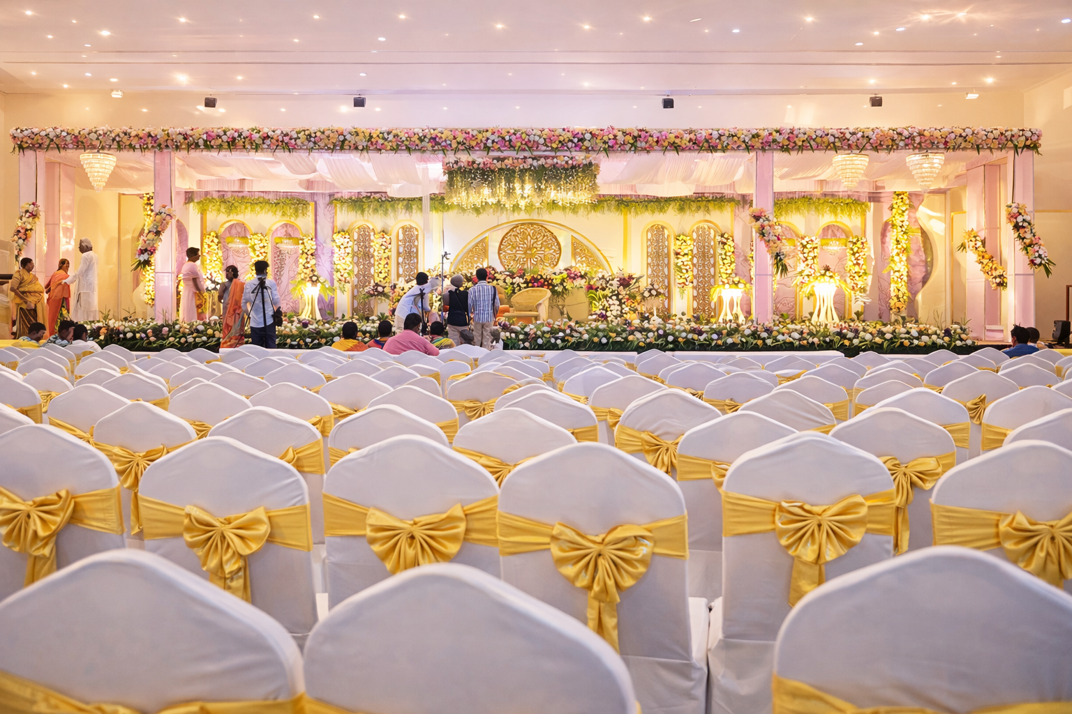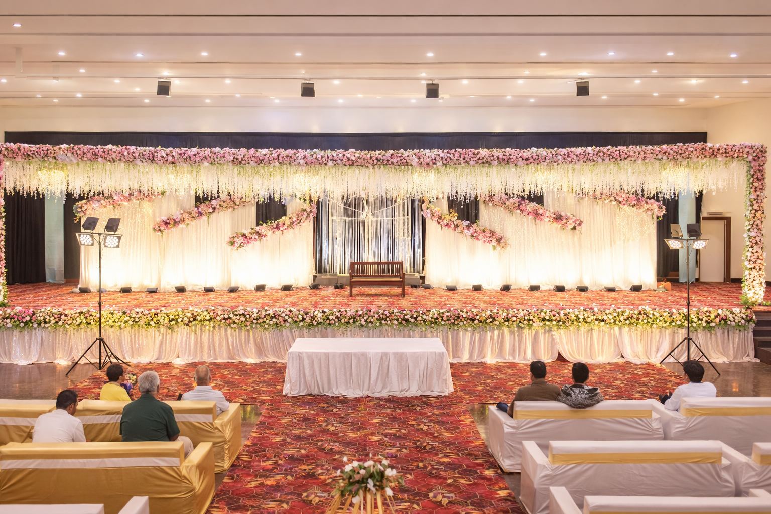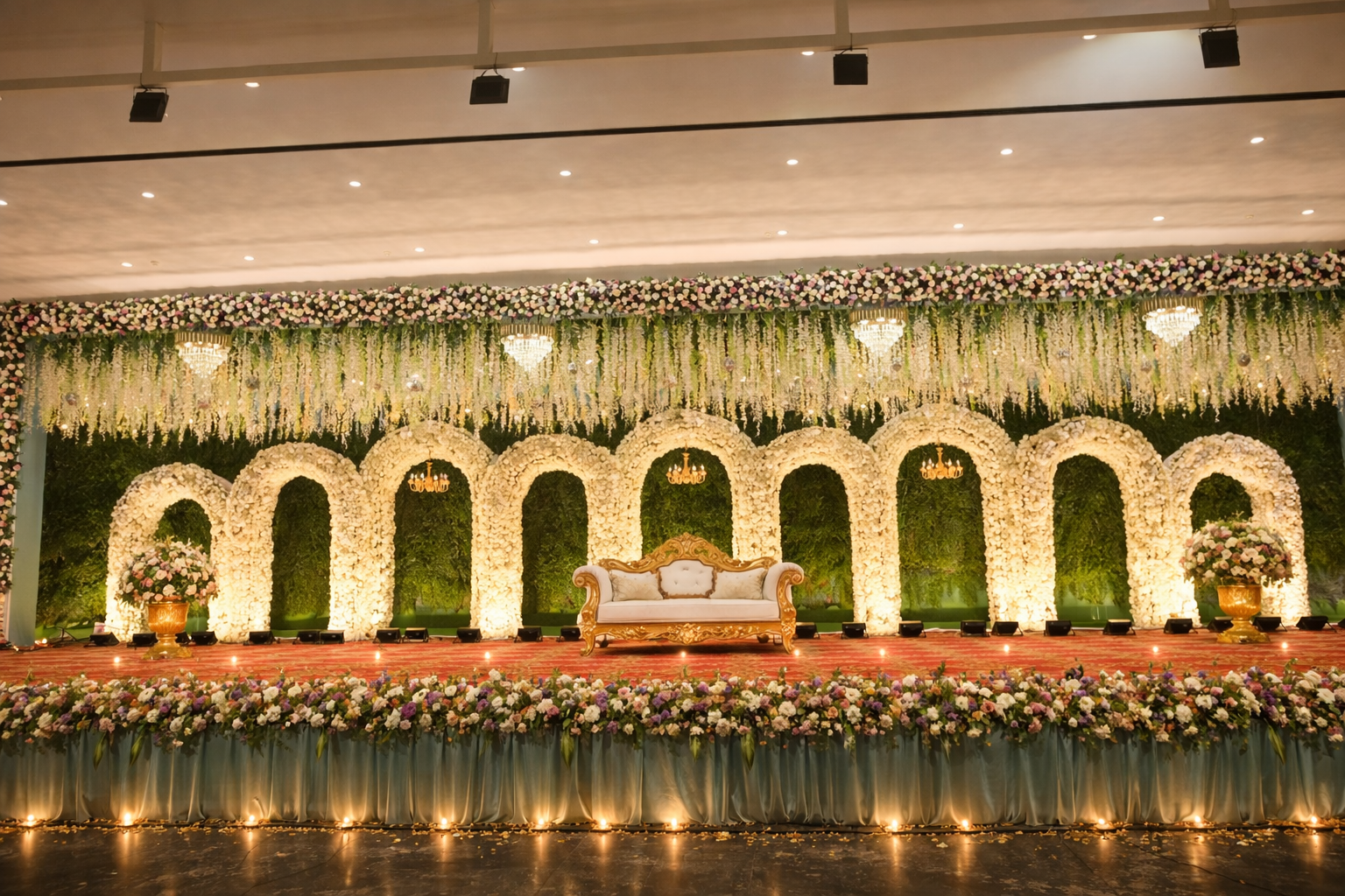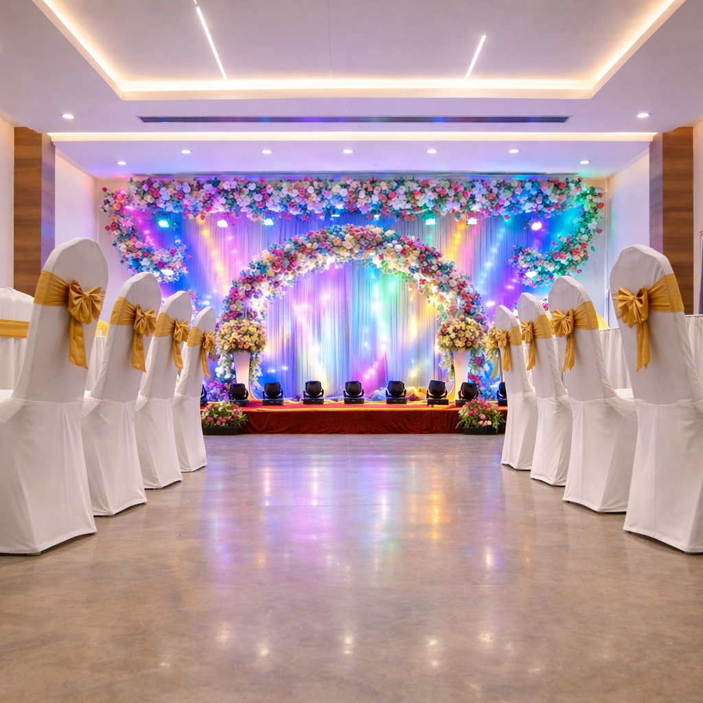 Premium wedding stage decoration with bright lighting at VVR Convention Hall