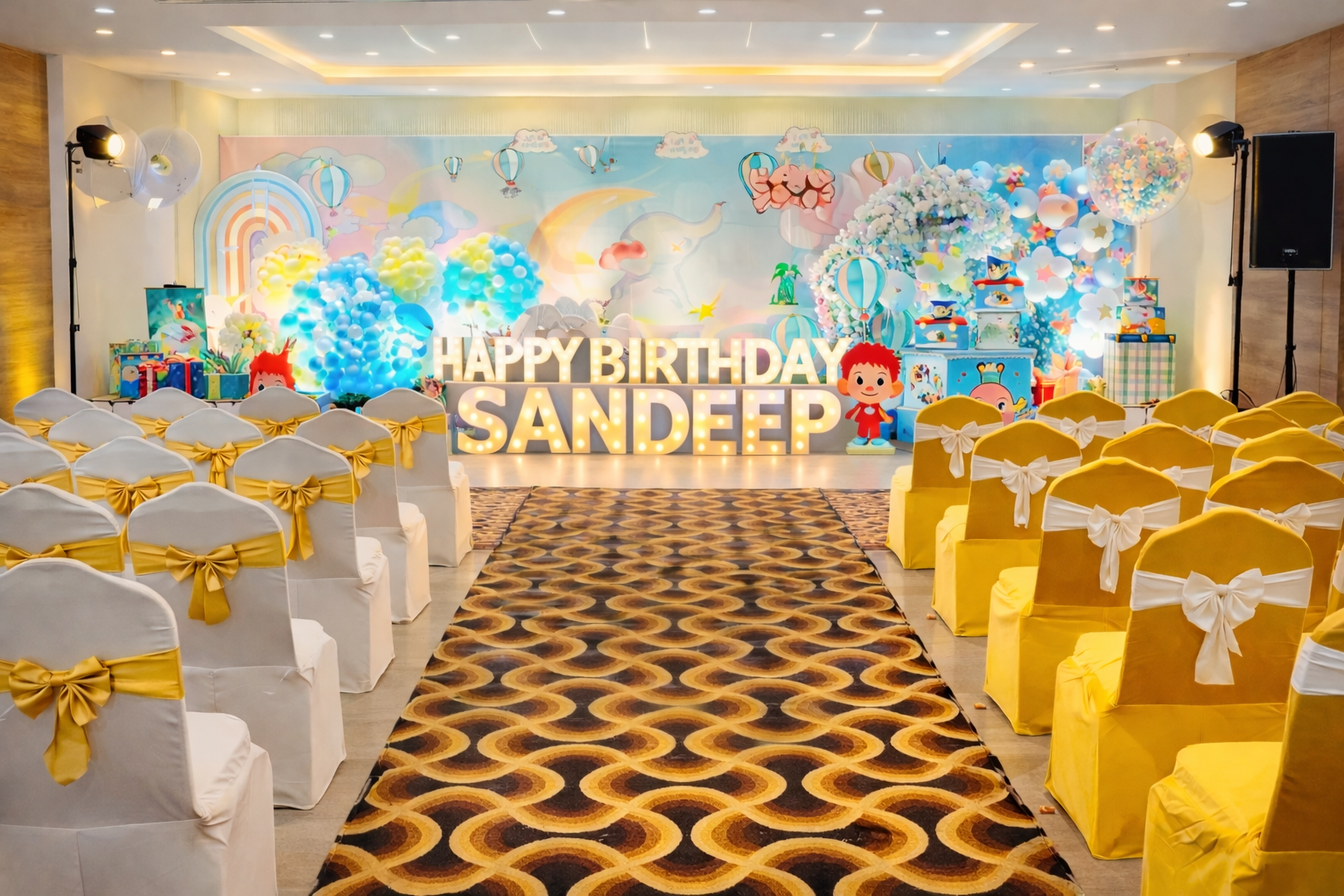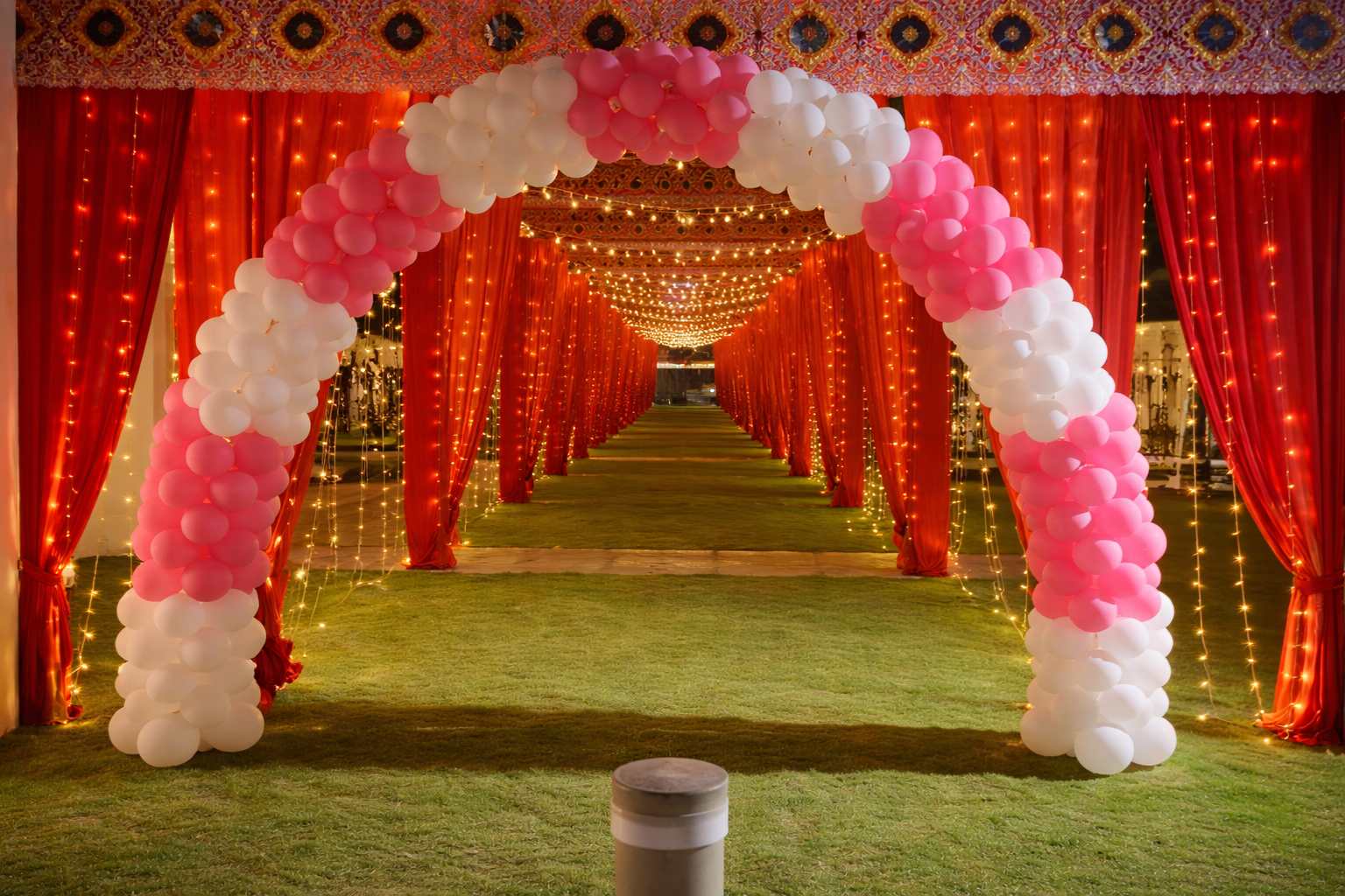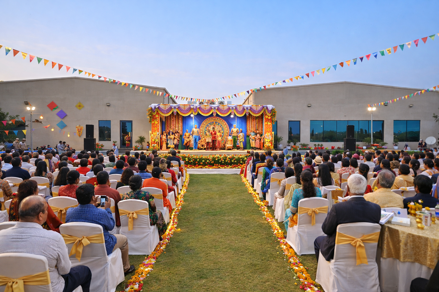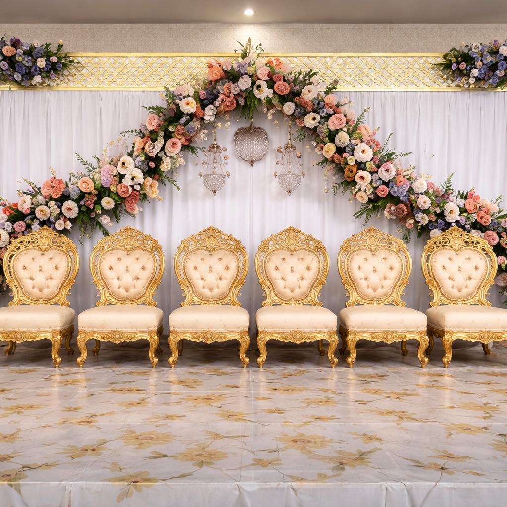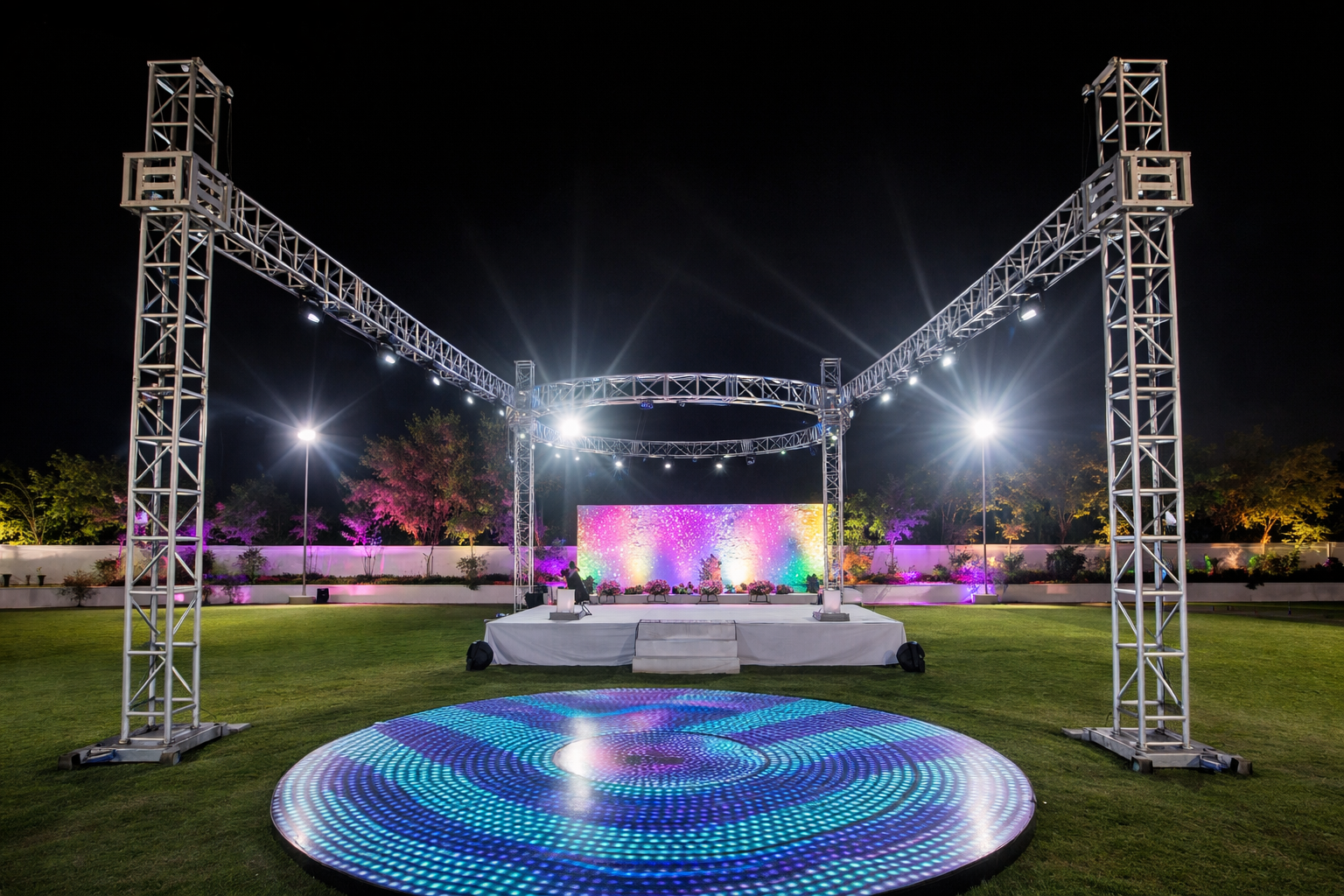 Premium wedding stage decoration with bright lighting at VVR Convention Hall