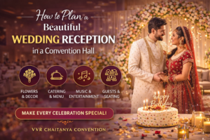 Beautiful wedding reception setup at VVR Chaitanya Convention Hall with floral decorations and grand entrance.